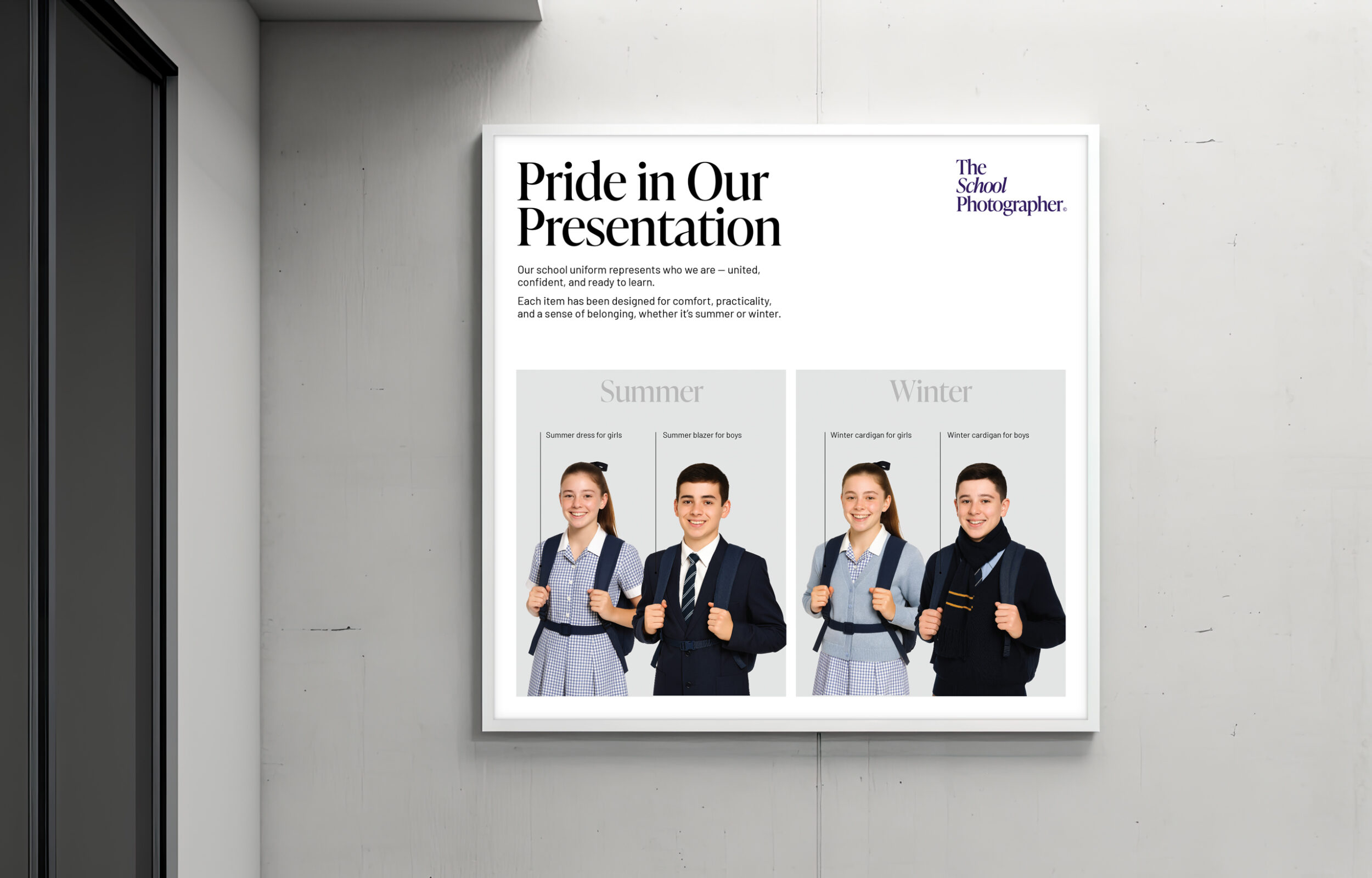 This framed poster showcases your Summer, Winter and Sports Uniform, and comes ready to hang in your foyer or Uniform Shop.